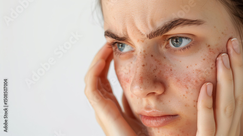 close-up portrait of a woman with acne, skincare, problematic skin routine