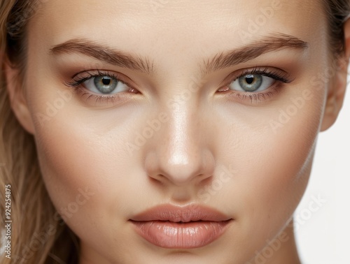 Close-up Portrait of a Woman with Blue Eyes and Soft Makeup