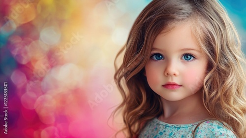 Close-up portrait of a young girl with long curly hair and blue eyes against a colorful bokeh background Copy Space