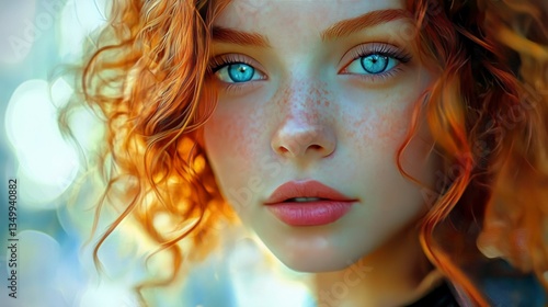 Close-up portrait of a young woman with vibrant red curly hair and striking blue eyes, freckles, and soft makeup.