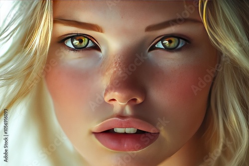 Close-up portrait of an American woman with blonde hair green eyes and natural makeup