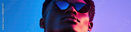 Close-up Portrait of Person Wearing Sunglasses under Dual Colored Lighting