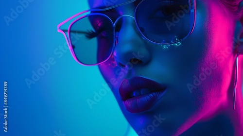 Closeup portrait of young woman wearing sleek sunglasses luminous vibrant neon glow on her face highlighting her serene expression Concept of youth beauty fashion and style modern life : Generative AI
