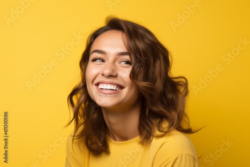 Close-up portrait photography of a satisfied girl in her 20s smiling against a yellow background. With generative AI technology
