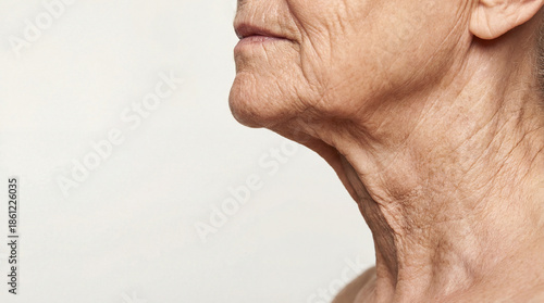 Close-up presents the neck and lower face of an aged woman. Her skin reveals the lines and texture of time, showing the enduring beauty of natural aging.