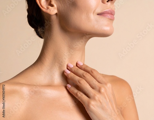 Close-up profile of a woman's neck and chest, hand gently touching her throat