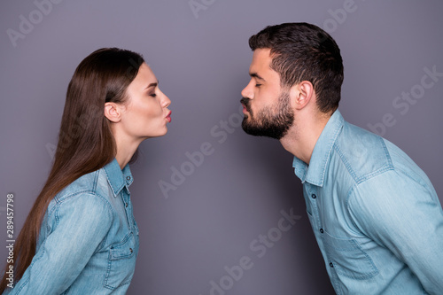 Close-up profile side view portrait of two her she his he nice attractive charming shy sweet tender gentle dreamy person kissing pouted lips first time isolated over gray violet purple pastel