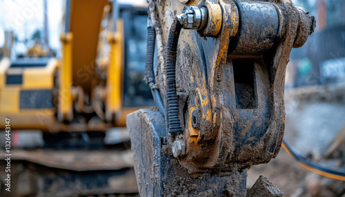 Close-up reveals the intricate details of a heavy machinery component covered in dirt, situated at a construction site. Background displays additional machinery engaged in work