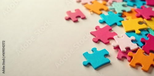 Close-up shot of assorted plain puzzle pieces, scattered on a neutral background Perfect for illustrating concepts of problem-solving, strategy, and completion , close up, puzzle pieces, building