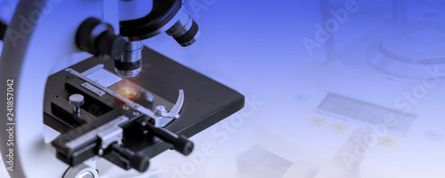 Close-up shot of microscope with laboratory equipment background