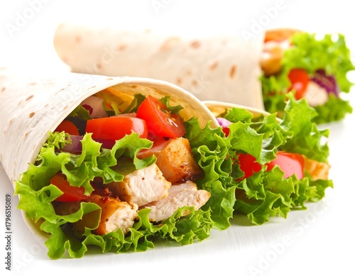 Close-up shot of three chicken wraps, showcasing filling of fresh vegetables, and rolled in tortilla