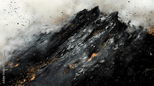 Close-up, stark imagery of a burnt mountain, with a focus on the ash-covered ground and residual burning embers, isolated background. Ashen. Illustration
