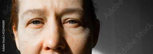 Close-up, the face of a mature middle-aged woman, a 50-year-old lady looks into the camera on a dark background. A busy life, a healthy lifestyle and positive emotions are the key to a happy life