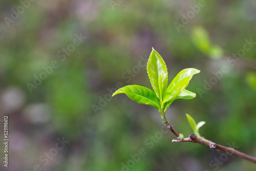 Closeup, Top of Green tea leaf in the morning, tea plantation, blurred background.
