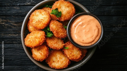 Closeup top view of crispy golden brown fried pickles served on a dark wooden table along with a side of creamy tangy dipping sauce This image showcases the delicious