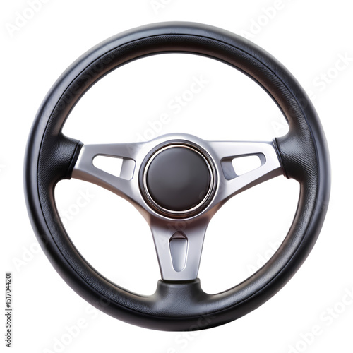 Closeup View of a Black Leather Steering Wheel with Silver Accents isolated on transparent baackground
