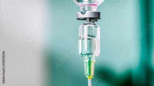 Close-up view of a medical intravenous IV drip in a sterile hospital environment