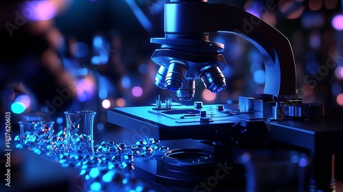 Close-up view of a microscope staged for examination with vibrant lighting and laboratory objects surrounding it : Generative AI