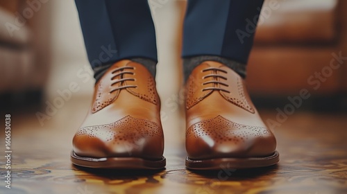Close-up view of a pair of brown leather dress shoes.
