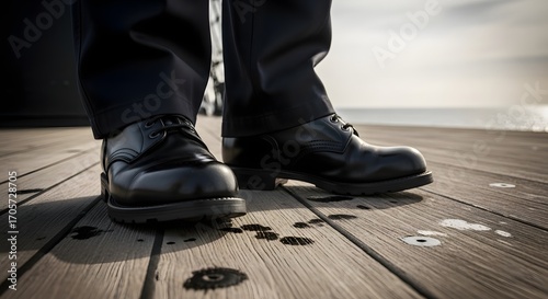Close-up view of a person's polished black dress shoes standing on a weathered wooden deck with water droplets.
