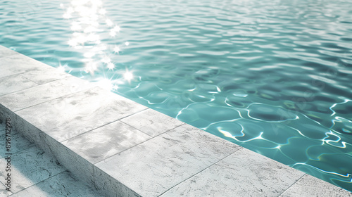 Close-up view of a refreshing blue pool with shimmering water and sunlight reflections, background