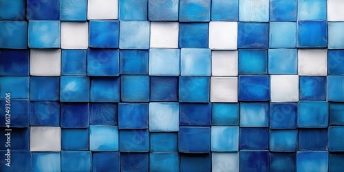 Close-up view of a wall made of small square tiles in various shades of blue and white arranged in a grid pattern with a textured and glossy finish