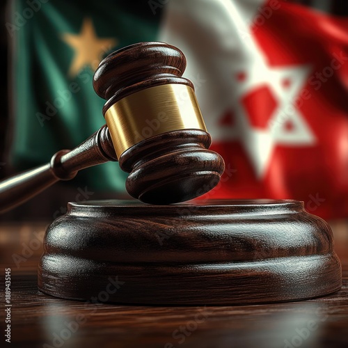 Close-up view of a wooden judge gavel with a brass band on a wooden sound block, with two blurred flags featuring stars in the background