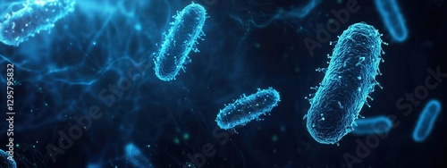 Close-Up View of Bacteria in a Dark Environment with Glowing Blue Light and Scientific Background Effects for Microbiology Concept