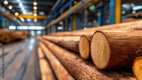 Close-Up View of Freshly Cut Timber Logs Stacked in a Modern Wood Processing Factory with Industrial Equipment in the Background
