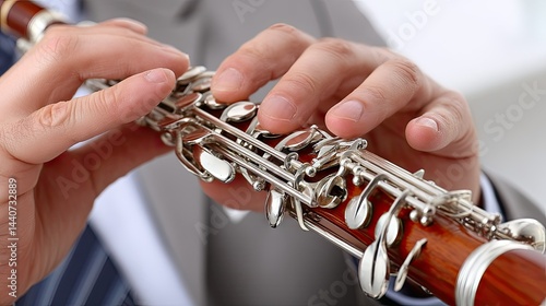 Close-up view of hands skillfully playing the clarinet in formal attire against a clean white background highlighting musical artistry and intricate details