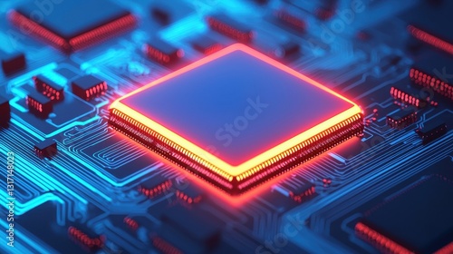 Close-Up View of Modern Microchip with Blue and Red Lighting Effects
