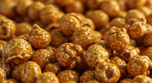 Close-up view of numerous caramel-coated popcorn kernels, showcasing the glossy, golden-brown finish and intricate texture.