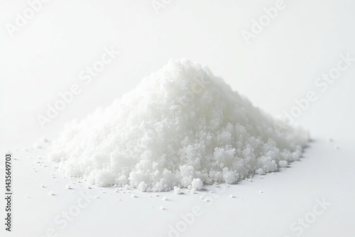 Close-up view of refined white sugar crystals against a bright white background, delicious, candy