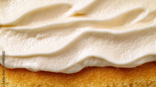 Close-up view of smooth white cream filling delicately spread on a fluffy golden sponge cake base, highlighting rich texture, tempting appeal of this delicious dessert, perfect for any sweet occasion