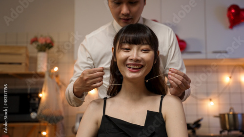 closeup with surprised asian woman wearing black dress smiling as her boyfriend putting a beautiful necklace on her during valentine’s day dinner at home