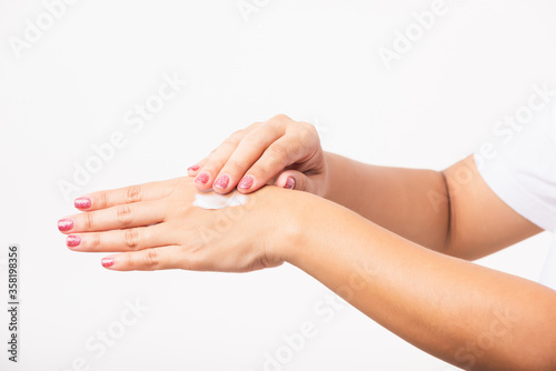 Closeup young Asian woman applying lotion cosmetic moisturizer cream on her behind the palm skin hand, studio shot isolated on white background, Healthcare medical and hygiene skin body care concept