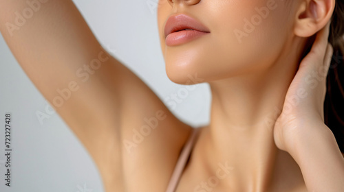 Closeup young beautiful woman showing armpit with smooth clean skin on solid background