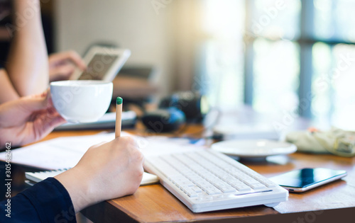 Close-up young businesswoman writing notebook and holding coffee cup to drink while she working with friend