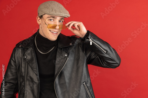 Close-up young man's portrait isolated over red studio background with copyspace. Retro style