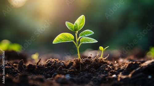 Close-up young plant growing in the soil concept save nature or agriculture on soft green tree background.