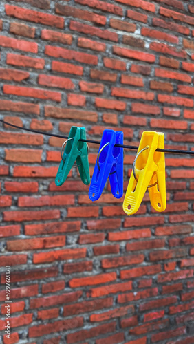 clothespins attached to stretched wire. clothespins attached to the clothesline