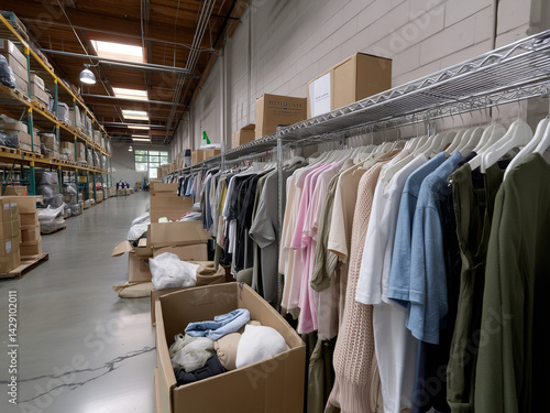 Clothing ware house with clothes in boxes, folded and stack neatly on shelf and hanging on the rack