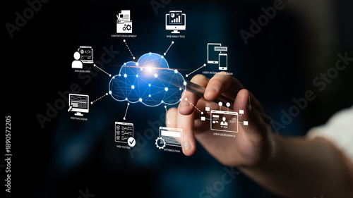 Cloud computing, cloud strategy, and cloud technology transforming digital infrastructure with scalable services, secure data storage, and cloud-based digital business solutions. Spline