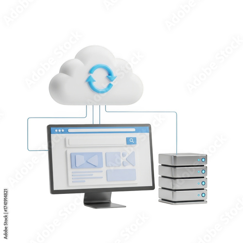 Cloud computing data storage server network technology computer monitor connected to cloud isolated on transparent background