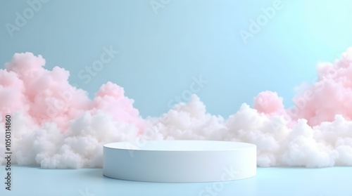 Cloud platform, blue, pink pastel sky, white podium for product display