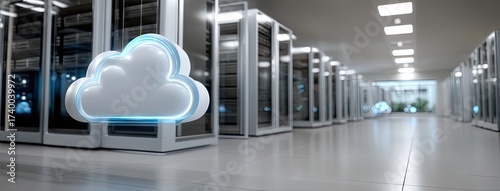 Cloud storage concept surrounded by server infrastructure showcasing modern technology in a data center environment