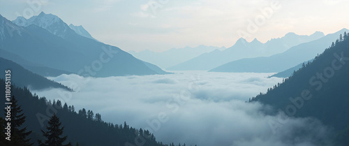 Cloud-Covered Peaks Surrounding Lush Valleys with Soft Fog Creating a Calm and Serene Atmosphere in a Majestic Mountain Landscape