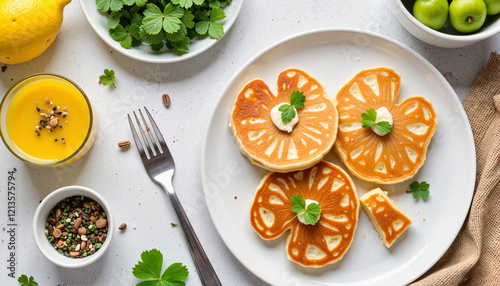 Clover-shaped pancakes on breakfast table in morning light, St. Patrick's Day
