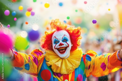 Clown, vibrant costume and joyful expression celebrating at a festival surrounded by colorful balloons, entertainment and festive atmosphere for family fun.