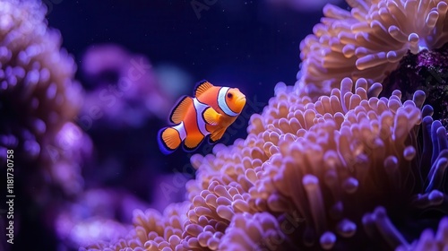 Clownfish swimming among purple corals underwater scene marine life vibrant environment close-up view ocean diversity